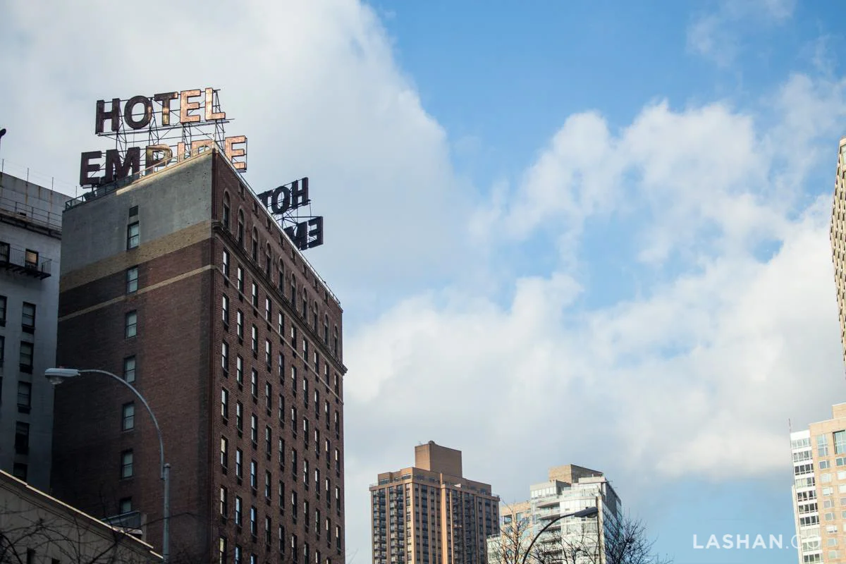 View of city buildings under a partly cloudy sky, with a neon sign on a tall brick building that reads 'HOTEL EMPIRE'.