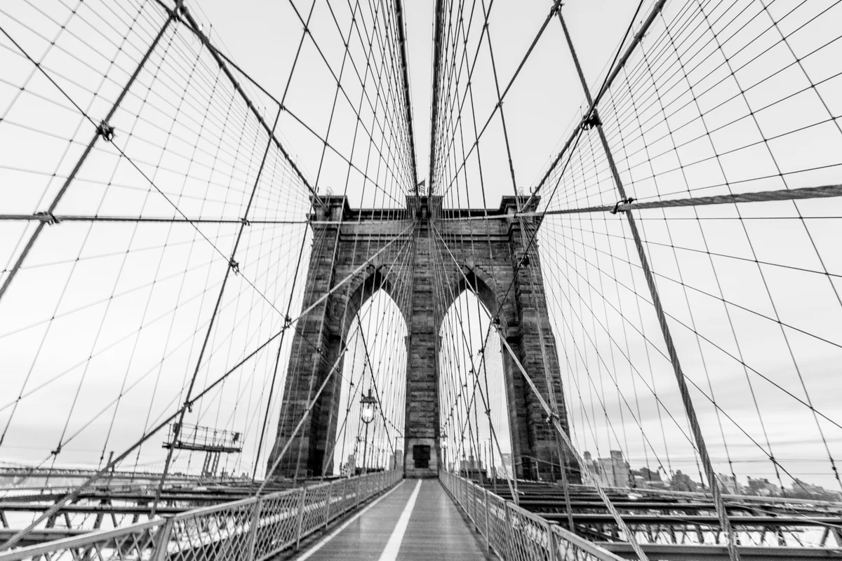 Black and white photograph of the Brooklyn Bridge in New York City, taken from the pedestrian walkway, showing the stone towers and the web of suspension cables. View fullsize