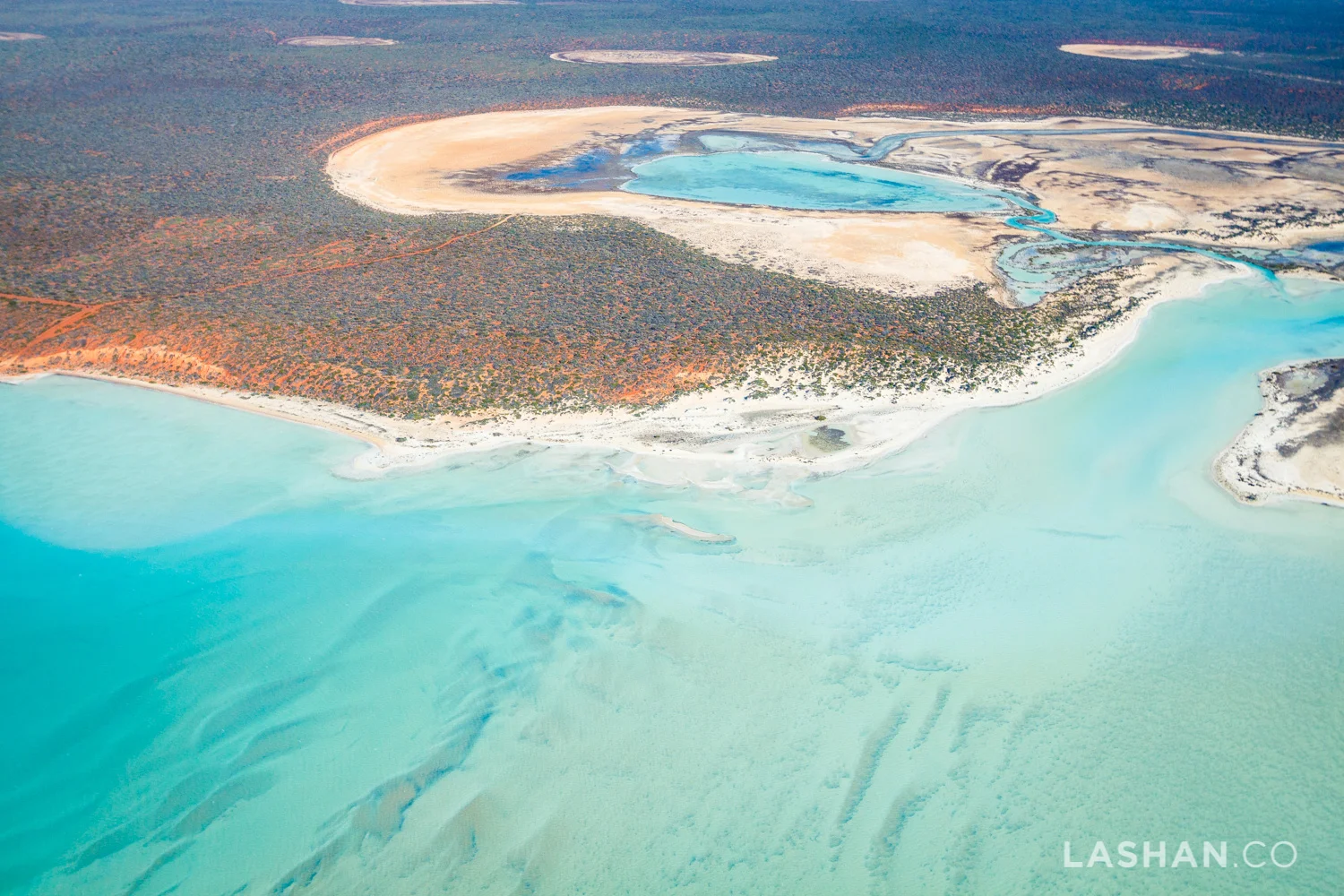 Aerial view of a coastal area with turquoise waters, sandy beaches, and a forested land with a small inland lake.